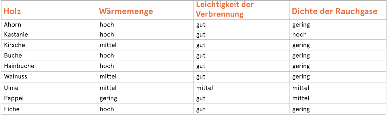 Dichtere Hölzer wie Buche, Eiche, Esche und Hainbuche garantieren eine langsame und gleichmäßige Verbrennung und erzeugen eine konstante und lang anhaltende Wärme. Weiche Hölzer hingegen verbrennen schneller.