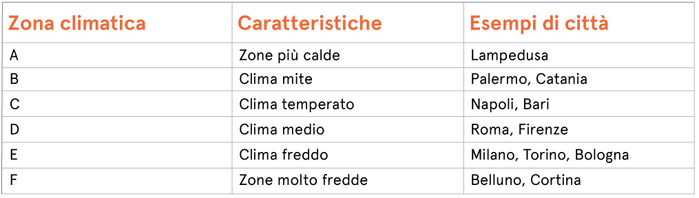 Le zone climatiche sono state introdotte con il Decreto del Presidente della Repubblica del 26 agosto 1993, n. 412. In questo Decreto, l’Italia è suddivisa in sei zone climatiche, definite in base ai gradi-giorno e quindi alla durata media della stagione di riscaldamento.