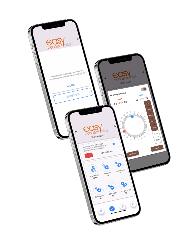 Met de nieuwe app Easy Connect Plus, en de geïntegreerde Wi-Fi en Bluetooth technologieën, kunt u alle CADEL kachels inschakelen, programmeren, bedienen en uitschakelen, rechtstreeks vanaf uw smartphone, waar u ook bent.